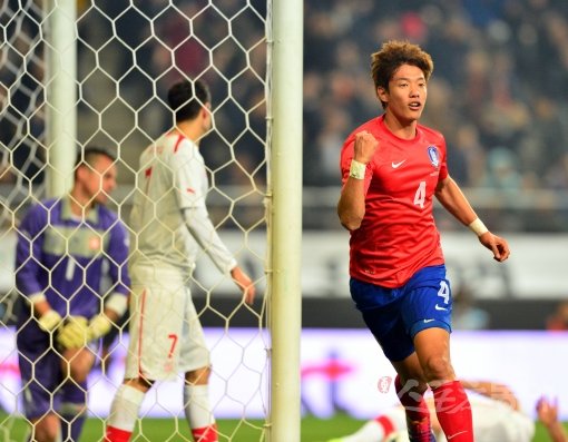 홍명보 감독이 이끄는 축구대표팀이 15일 서울월드컵경기장에서 스위스와 평가전을 가졌다. 후반전 홍정호가 헤딩슛으로 동점골을 터트린 후 세리머니를 펼치고 있다.