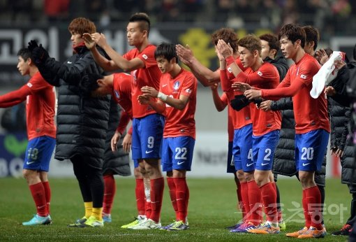 15일 서울월드컵경기장에서 한국 축구대표팀이 FIFA 랭킹 7위 스위스와 7년만의 리턴매치를 가졌다. 2-1 승리를 거둔 축구대표팀이 경기 종료 후 팬들에게 인사하고 있다.