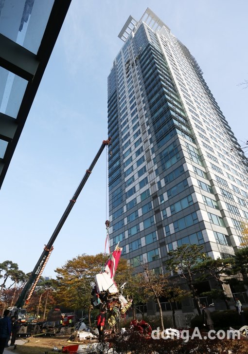 16일 오전 8시 55분께 서울 삼성동 아이파크 38층짜리 아파트에 LG전자의 민간 헬리콥터가 충돌해 추락했다. 이날 호후 관계자들이 헬기 잔해 인양 작업을 하고 있다.