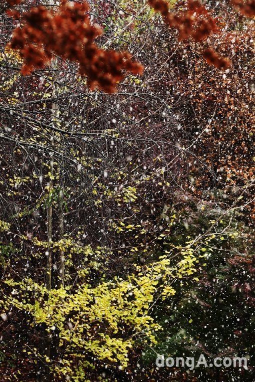 서울에 첫눈이 내린 18일 오후 서울 종로구 경희궁에 눈발이 흩날리고 있다.