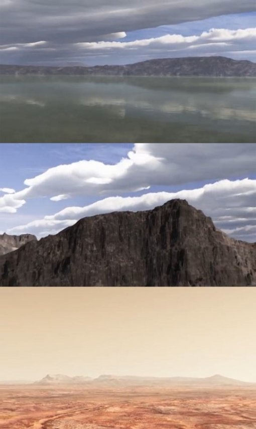 영상 속 ‘40억년 전 화성’은 처음에는 두꺼운 대기가 존재해 액체인 물이 가득한 바다도 있었으며 파란 하늘과 하얀 구름이 떠 있는 평온한 모습이다.