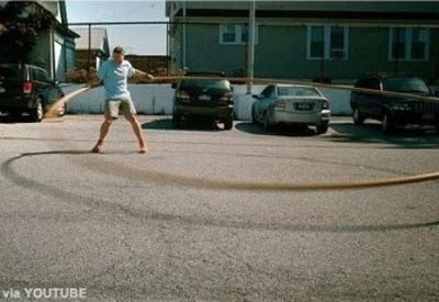 공개된 ‘거대 훌라 후프 돌리는 남자’ 영상에는 직경 5미터가 넘는 훌라후프를 거뜬히 돌리고 있는 한 남자의 모습이 담겨 있다. 그는 지름이 5.04m의 거대 훌라 후프를 세 바퀴 반 돌려 기네스북 세계 기록을 세웠다.