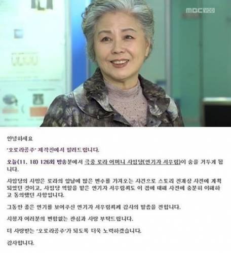 18일 해당 홈페이지에는 “‘오로라 공주’ 제작진에서 알려드립니다. 오늘(11.18) 126회 방송 분에서 극중 로라(전소민 분) 어머니 사임당(연기자 서우림)이 숨을 거두게 됩니다”라는 공지 글이 게재됐다.