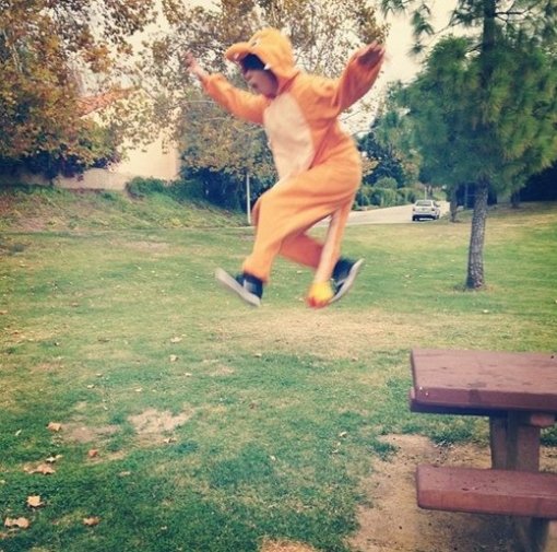공개된 ‘엠버 파이리’ 사진 속 엠버는 파이리 의상을 입고 즐거운 표정을 지으며 높이 점프를 하고 있다.