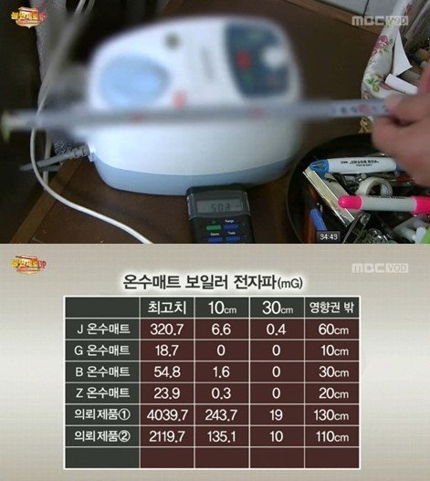 온수매트에서 이같은 전자파가 발생하는 이유는 매트와 연결된 보일러 때문이었다. 온수매트가 전자파 위험이 적다고 알려진 것은 보일러를 제외한 매트에서만 전자파를 검사했기 때문이라고 이 방송은 전했다.