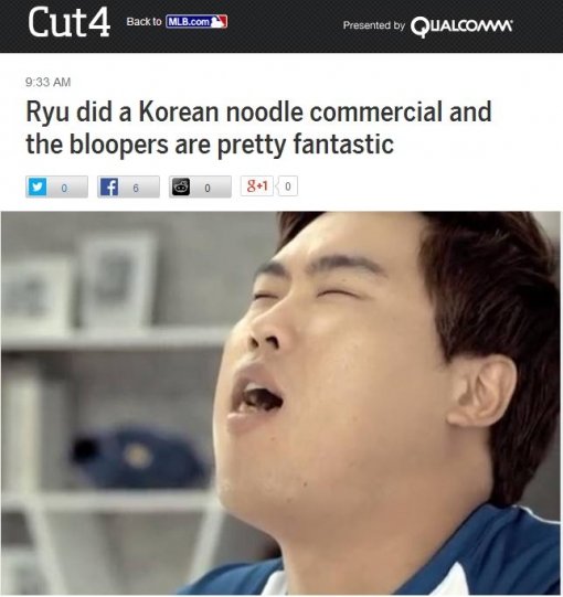 메이저리그 공식 홈페이지 MLB.com의 Cut4는 21일(한국시각) 류현진의 라면 광고 촬영 영상과 이를 캡처한 사진을 게재하며 관심을 나타냈다.