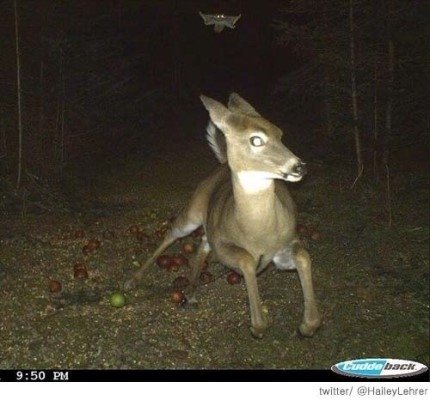 공개된 사진에는 사슴 한 마리가 공포에 질린 채 달리는 모습이 담겨 있다. 사진 속 사슴이 줄행랑치는 이유는 다람쥐 때문이다. 사슴의 뒤에는 날다람쥐 한 마리가 앞을 향해 비행하고 있다. 플래시에 두 눈이 번쩍여 무서운 느낌을 주고 있다.