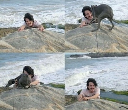 하지만 이는 개가 상황을 착각한 것. 주인인 남성이 절벽에 매달린 것처럼 상황을 연출했던 것이다. 남성은 개의 모습에 웃음을 참지 못하고 폭소했다.