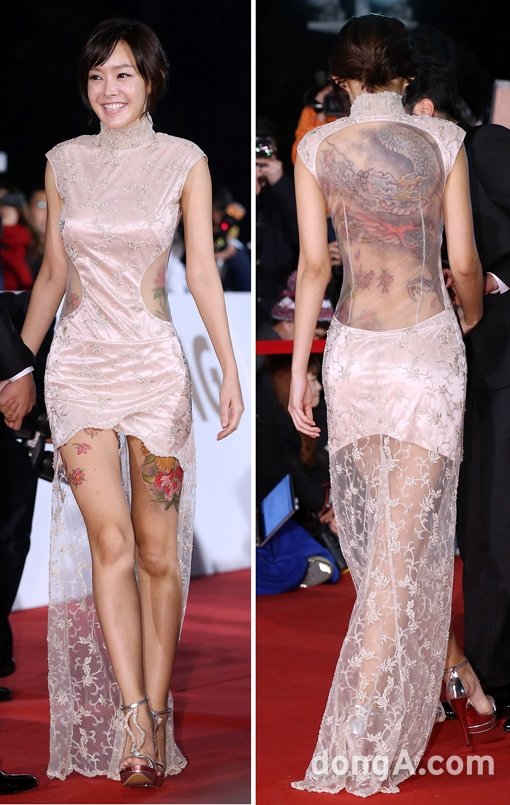 김선영은 등 부분에 커다란 청룡 타투를 한 채 허리와 다리 부분에도 꽃 타투를 새기고 등장해 시선을 사로 잡았다. 특히 김선영은 속이 훤히 비치는 시스루 드레스를 입어 타투를 더욱 돋보이게 했다.