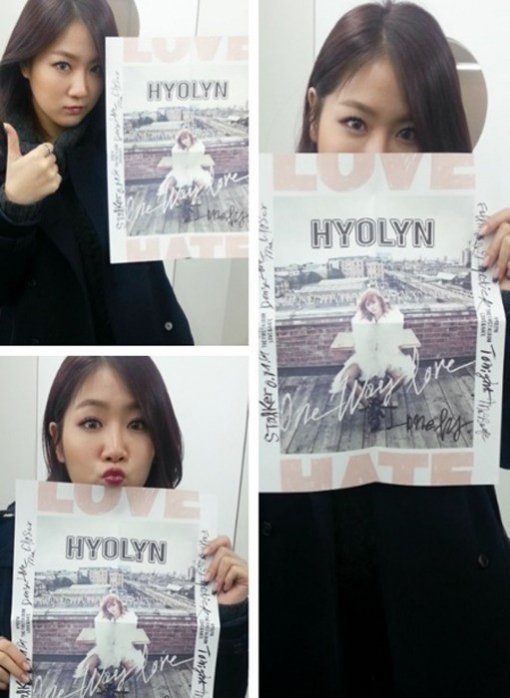 사진 속 소유는 효린의 솔로앨범 포스터를 들고 엄지를 치켜 세우는가 하면 입술을 내미는 애교를 부리며 효린을 응원했다.