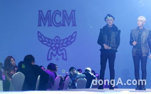 배우 이윤미(왼쪽)가 26일 오후 서울 중구 롯데호텔 크리스탈 볼룸홀에서 열린 독일 정통 명품 브랜드 MCM 2014년 봄-여름 패션쇼에서 샤이니 무대를 보고 있다.