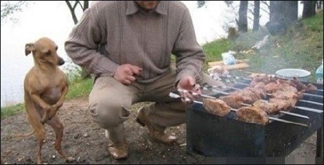 공개된 ‘배고픈 개의 간절한 표정’ 사진 속에는 숯불에 두툼한 고기를 굽고 있는 주인의 모습과 그 옆에 두 발로 서서 앞발을 모으고 공손히 서있는 개의 모습이 담겨 있다. 개는 마치 주인에게 공손한 자세로 음식을 달라고 부탁하는 듯 보여 웃음을 자아낸다.