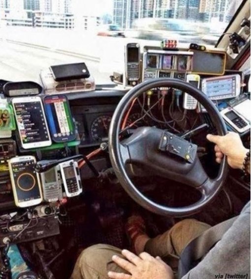 공개된 택시 운전석 옆에는 온갖 종류의 휴대폰들이 보인다. 자동차 핸들과 계기판을 제외한 모든 곳에 휴대폰으로 도배돼 있다.