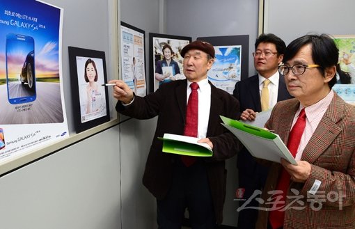 스포츠동아 광고대상 심사를 맡은 김광규 한국브랜드협회장, 이승욱 스포츠동아 광고마케팅국장, 이수갑 홍익대 교수(왼쪽부터)가 26일 서울 세종로 스포츠동아 회의실에서 후보작들을 살펴보고 있다. 김종원기자 won@donga.com 트위터@beanjjun