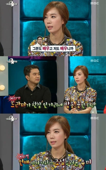 김유미는 27일 방송된 MBC ‘황금어장-라디오스타’에 출연해 정우에 대한 질문에 입을 열었다.