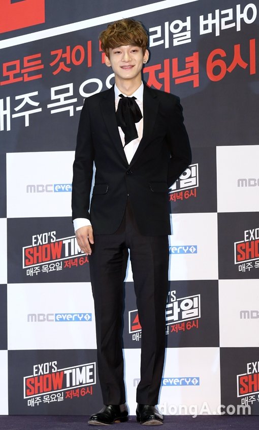그룹 엑소의 멤버 첸이 28일 오후 영등포구 여의도 CGV에서 열린 MBC에브리원 ‘EXO의 쇼타임’제작발표회에서 포토타임을 하고있다.