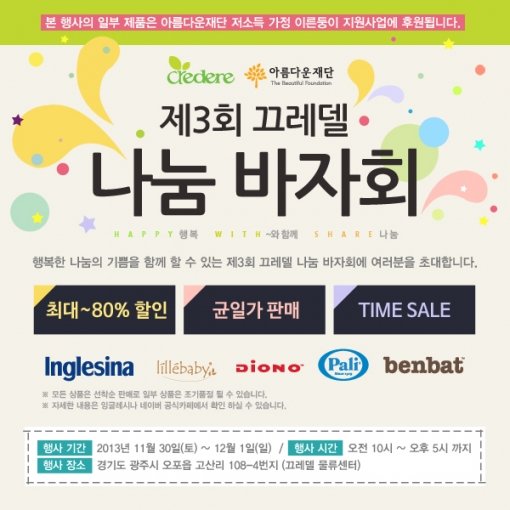 특히 이월상품 및 전시 진열 상품을 파격 할인가에 구매할 수 있으며, 바자회 특별 이벤트로 행사기간 양일 오전 11시, 오후 2시에 ‘타임세일’ 행사가 진행된다. 행사에는 잉글레시나 유모차, 카시트 등 2013 베스트 인기 상품이 파격 할인가에 판매된다.
