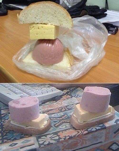 공개된 ‘뭉텅이 샌드위치’ 사진 속에는 커다란 빵 위에 두툼한 치즈, 소시지 등의 재료가 전혀 손질되지 않은 채 뭉텅이로 올려진 샌드위치 모습이 담겨 있다.