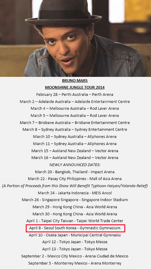 브루노 마스의 공식 홈페이지에 따르면 브루노 마스는 2014년 2월 28일 호주 퍼스 공연을 시작으로 일본, 뉴질랜드, 홍콩 등 전 세계를 도는 '2014 더 문샤인 정글 투어'에 나선다.