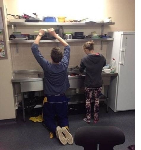 사진에는 설거지를 하는 여자와 그 옆에서 정리를 하고 있는 남자의 모습이 함께 담겨 있다.