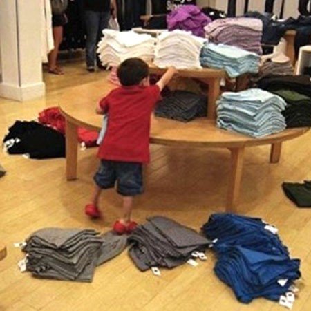 공개된 ‘알바생이 두려워하는 아기’ 사진 속에는 의류매장에 잘 정리돼 진열해 놓은 옷들을 한 아기가 모두 바닥으로 끌어내려 매장을 엉망진창으로 만드는 모습이 담겨 있다.