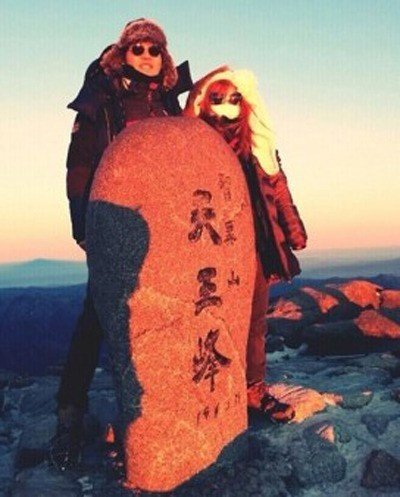사진 속 두 사람은 지리산 정상에 올라 멋진 풍경을 배경 삼아 포즈를 취하고 있다.