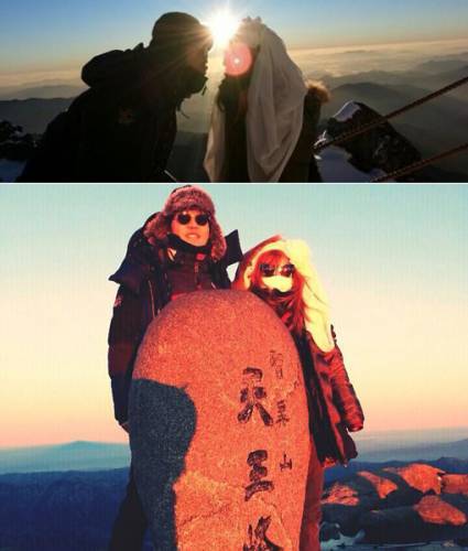 사진에는 조정치 정인 부부가 지리산의 최고봉인 천왕봉에 오른 모습이 담겨 있다. 두 사람은 완전무장한 채 카메라를 바라보고 있다.