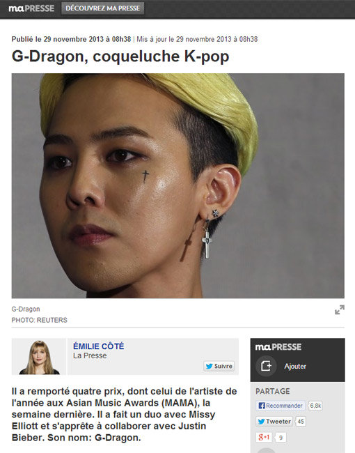 또 ‘라프레스’는 지드래곤이 특유의 매력적인 스타일로 대중들에게 어필하고 있으며 트위터 230만 팔로워를 가진 아시아의 스타로서 많은 사랑을 받고 있다고 언급했고 퀘백 케이팝 포럼 관계자 ‘Julie Corneau’의 말을 인용해 지드래곤을 조명했다.