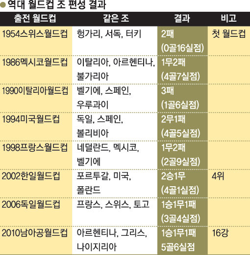 한국은 한일월드컵과 남아공월드컵에서 각각 ‘강호’ 포르투갈, 아르헨티나와 한 조에 속했다. 포르투갈은 루이스 피구 등 1991청소년대회 우승 주역들이 황금세대를 이뤘다. 아르헨티나도 ‘축구천재’ 메시를 비롯해 최고 기량의 선수들이 즐비했다. 그러나 나머지 2개 국가는 충분히 겨뤄볼 만한 팀이었다. 2002년에는 미국과 폴란드, 2010년에는 그리스, 나이지리아와 함께 했다. 한국은 남아공월드컵에서 아르헨티나에 1-4로 대패했지만 그리스와 나이지리아를 상대로 승점4를 확보했다. 한일월드컵에선 폭발적인 힘을 발휘했다. 포르투갈을 잡고 2승1무로 조1위를 확보했다. 한국은 이탈리아, 스페인을 거푸 꺾고 4위를 기록했다.
