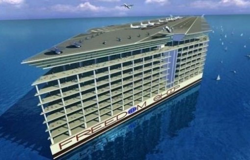 이 배의 이름은 ‘프리덤 쉽’(Freedom Ship)으로 병원, 학교, 쇼핑센터, 공원에 카지노는 물론 자체 공항까지 갖춘 거대한 해상 도시로 건조될 예정이다.