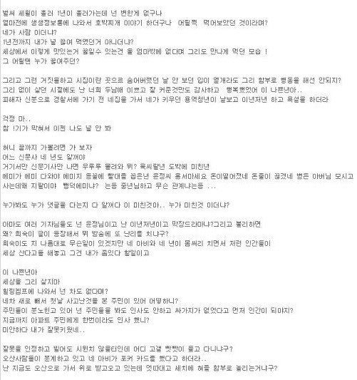 또 “디너쇼에도 가고 네가 녹화하는 ‘도전천국’에도 가고 하마. 세상이 널 등 돌릴 때까지 나 또한 이제 안 참는다. 사악한 너희 알랑한 무리들이 무릎을 꿇을 때까지 같이하고 함께 하자”라는 협박성의 내용이 담겨 있어 충격을 주고 있다.