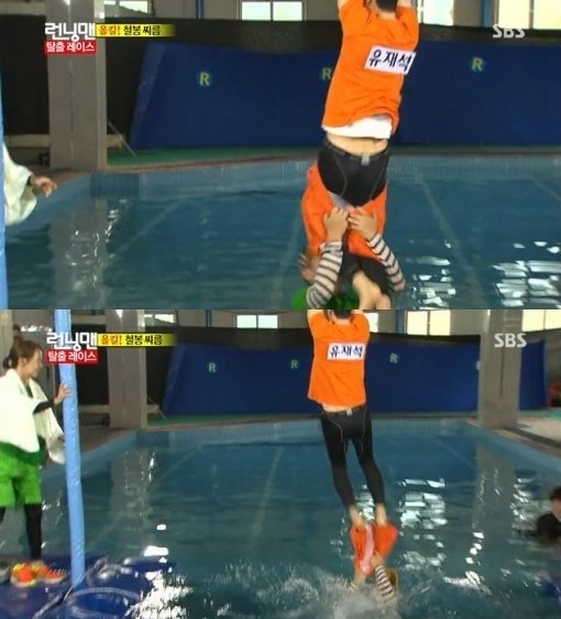 지석진은 힘에 부치자 동반 입수를 목표로 유재석의 옷을 잡고 늘어졌다.