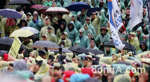 전국철도노동조합원들이 오후 서울역 광장에서 열린 ‘철도 노동자 총파업 출정식’에서 투쟁 구호를 외치고 있다. 이날 철도노조는 수서발 KTX 설립 이사회 개최 중단 등을 요구했다.