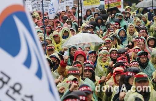 전국철도노동조합원들이 오후 서울역 광장에서 열린 ‘철도 노동자 총파업 출정식’에서 투쟁 구호를 외치고 있다. 이날 철도노조는 수서발 KTX 설립 이사회 개최 중단 등을 요구했다.