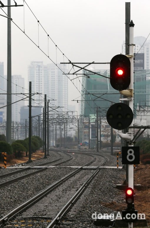 전국철도노동조합이 9일 오전 총파업에 돌입했다. 오후 서울역 빈 선로에 빨간 신호등이 켜 있다. 이날 오후 전국철도노동조합은 서울역 광장에서 ‘철도 노동자 총파업 출정식’을 열고 ,수서발 KTX 설립 이사회 개최 중단 등을 요구했다.