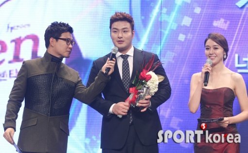 넥센 박병호가 9일 오후 5시 서울 장충동 신라호텔에서 열린 2013 카스포인트 어워즈에 참석해 ‘카스포인트 대상’ 을 수상을 한 후 인터뷰를 하고 있다.
