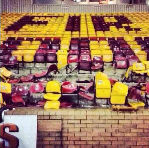 셀틱 서포터들이 부순 의자들은 마치 엿가락처럼 휘어지거나 반으로 접혀 있다. 이 사진은 SNS를 통해 삽시간에 퍼져나갔다.