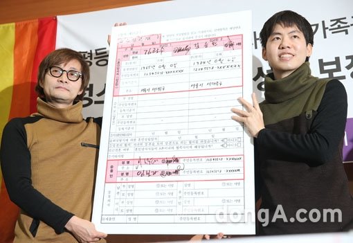 김조광수 감독과 김승환 레인보우팩토리 대표 부부가 10일 오전 서울 종로구 참여연대 느티나무홀에서 성소수자 가족구성권 보장 및 혼인신고 수리 촉구를 위한 기자회견에서 혼인신고서를 보이고 있다.