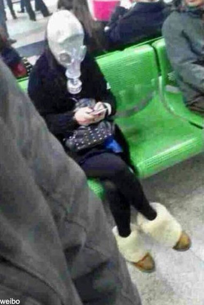 사진에는 공공장소에서 방독면을 쓴 인물의 모습이 담겨 있다. 이 인물은 도도한 자세로 스마트폰에 집중하고 있다. 화려한 백과 신발 등 감각적인 패션 센스가 돋보인다.