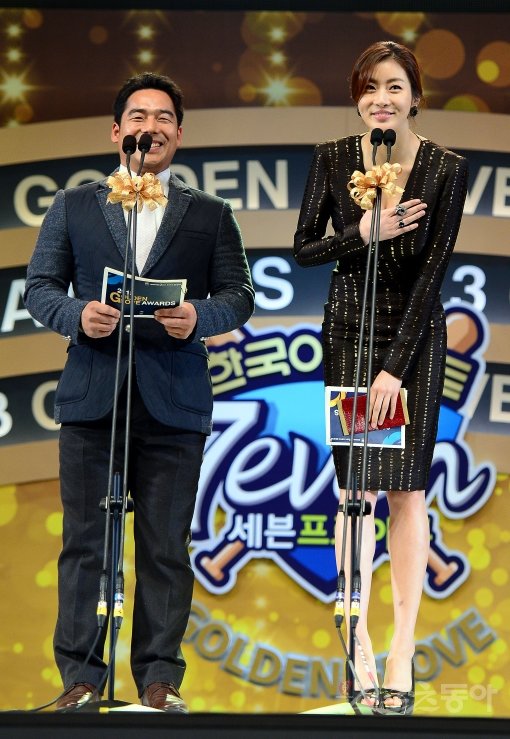 ‘2013 한국야쿠르트 세븐 프로야구 골든글러브 시상식’이 10일 오후 서울 삼성동 코엑스 오디토리움에서 열렸다. 이배영과 배우 강소라가 투수 부문 수상자를 발표하고 있다.