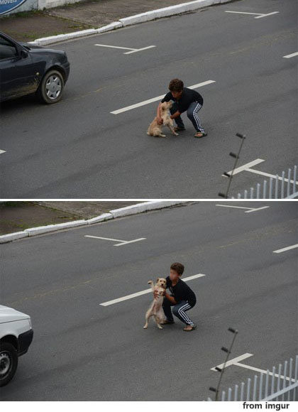 사진에 등장하는 소년은 자동차들이 달리고 있는 도로에서 뺑소니 교통사고를 당한 강아지를 구하기 위해 뛰어 들었다고 알려졌다.