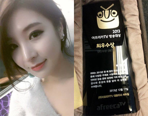 BJ 박현서가 ‘2013 아프리카TV 방송대상’ 최우수상 트로피를 인증했다.