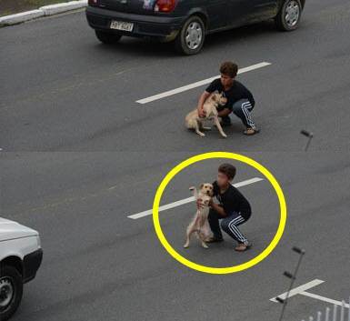 공개된 사진은 브라질의 한 마을에서 촬영된 것으로, 자동차가 달리는 넓은 도로 중앙에 서 있는 강아지를 한 소년이 밖으로 끌어내려 안간힘을 쓰는 모습이 담겨 있다.