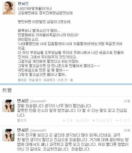 변서은은 18일 자신의 트위터에 “정말 죄송합니다. 생각이 너무 많이 짧았습니다”라는 글을 남겼다.