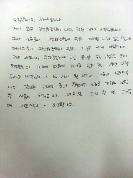 박근혜 대통령을 향한 막말 글로 인해 논란에 휩싸인 방송인 변서은이 SNS에 자필 사과 편지를 게재했다.