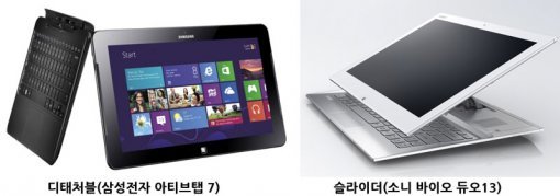 이런 사람을 위해 나온 것이 바로 ‘2 in 1’이라는 제품군입니다. 태블릿PC와 노트북의 형태를 오갈 수 있는 것이 특징이죠. 형태는 다양하지만, 윈도8/8.1 운영체제를 탑재하고 키보드를 기본으로 제공한다는 점은 동일합니다. 형태별로 살펴보면 키보드 부분을 분리해 화면 부분만 들고 다니며 쓸 수 있는 삼성전자의 아티브탭7(약 135만 원)과 화면 부분을 밀어 올려 형태를 전환하는 소니의 바이오 듀오13(약 200만 원) 같은 제품이 대표적이죠.