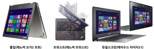 그 외에도 화면 부분을 180도 젖혀서 변신하는 레노버의 요가2 프로(약 180만 원) 그 외에 화면 부분을 돌려서 형태를 전환하는 레노버 트위스트(약 80만 원), 상판 양면에 각각의 화면을 갖춘 에이수스 타이치31(약 150만 원) 등의 형태도 있으니 각자의 취향에 맞는 제품을 고르도록 하십시오.