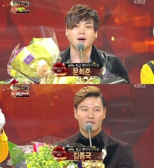 문희준과 김종국은 21일 오후 서울 여의도 KBS 신관 공개홀에서 진행된 시상식에서 정보·쇼오락 최고 엔터테이너상을 수상하는 영광을 차지했다.