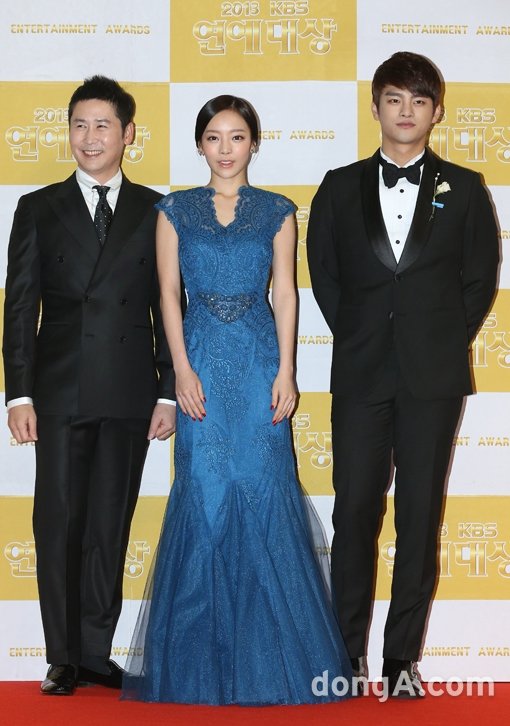 신동엽, 구하라, 서인국이 21일 오후 서울 영등포구 KBS 신관공개홀에서 열린 ‘2013 연예대상’에서 포토타임을 하고있다.