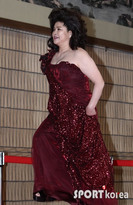 이날 이영자는 버건디 컬러의 드레스를 입고 레드카펫을 밟았다. 이영자가 풍만한 몸매를 한껏 드러내 눈길을 끌었다. 그는 의상과 더불어 미스코리아 느낌의 풍성한 헤어스타일을 선보였다.